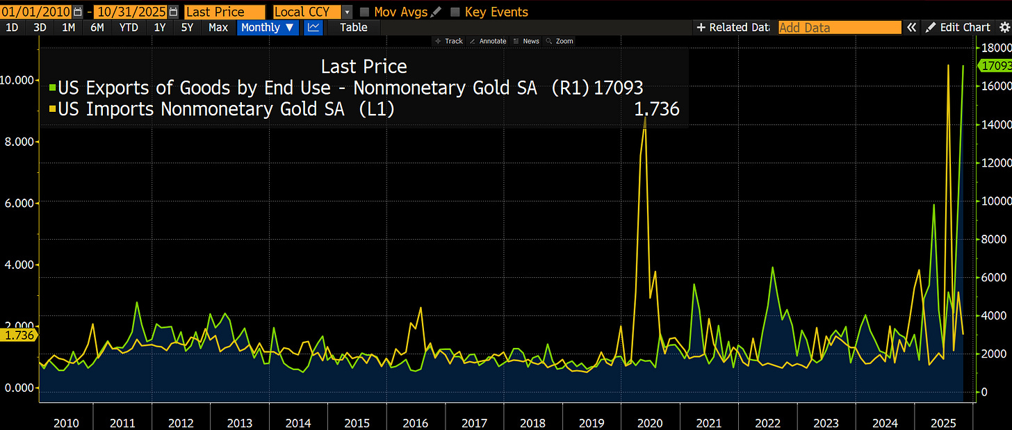 The Oct US trade data show sharp gains in US exports of both gold and non-gold “other precious metals” (think silver, platinum, palladium).